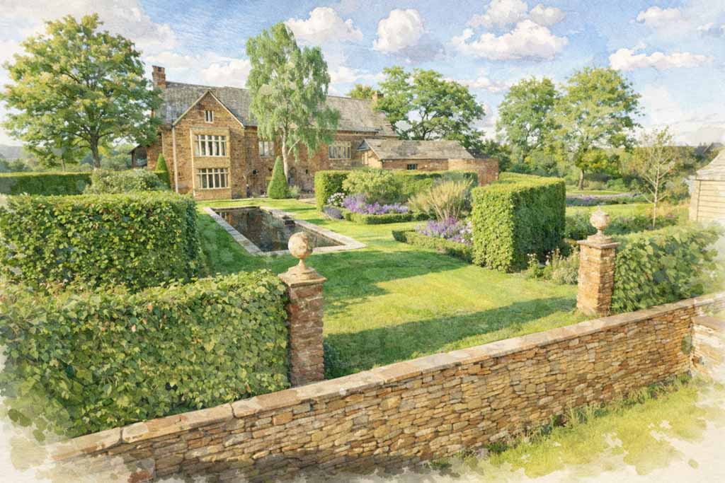 The house benefited from having owning land beyond the garden. This was divided from the garden by a tall evergreen hedge. We were able to create a wonderful vista by removing some of this hedge and installing a haha wall. An avenue of hornbeam trees was planted to guide views into the parkland in the distance.